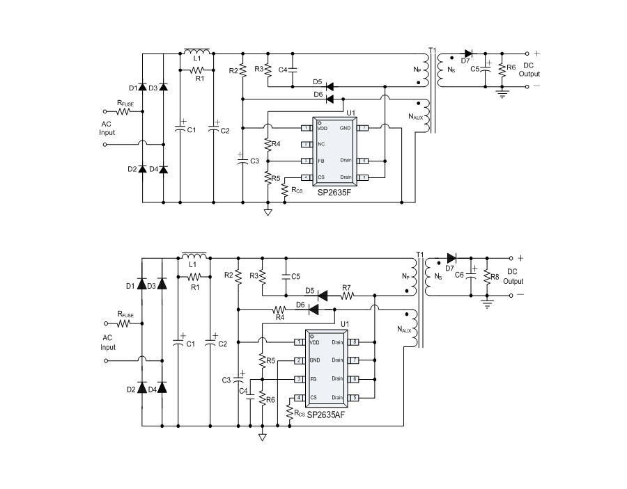 SP2635F是一款性能优异的原边反馈控制电路,应用于小功率AC/DC充电器与适配器。控制电路使用原边采样技术进行精确的恒流、恒压控制,可以省去一般应用中的光耦与TL431。