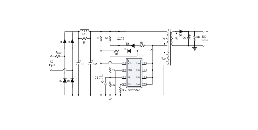 SP2637AF是一款性能优异的原边反馈控制电路,应用于小功率AC/DC充电器与适配器。控制电路使用原边采样技术进行精确的恒流、恒压控制,可以省去一般应用中的光耦与TL431。